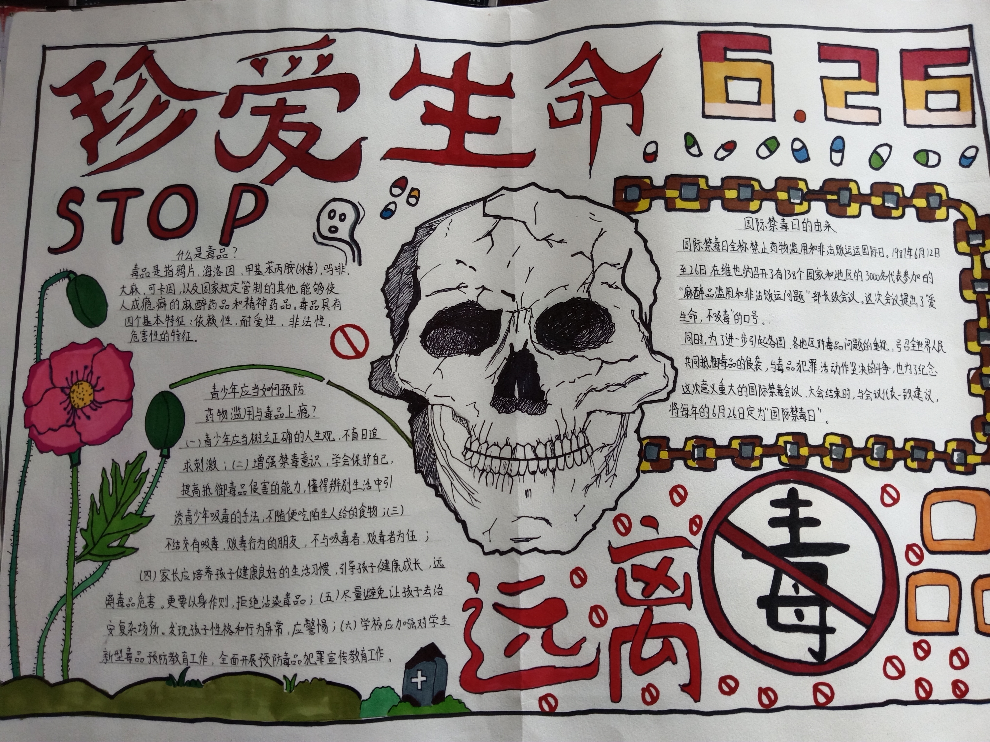 活动前期,学校组织“禁毒手抄报创意大赛”,学生们围绕“珍爱生命 远离毒品”主题,用画笔描绘毒品危害。“骷髅头”“禁止符号”等警示元素与“珍爱生命 远离毒品”的标语相映成趣,一幅幅作品既展现艺术创意,更表达拒毒决心。经评委评选,共有31名同学获奖并获得相应奖品,同时他们的作品在校园文化墙展出,成为流动的禁毒宣传阵地。参赛同学踊跃分享道:“画手抄报时,我查了很多案例,现在特别想告诉身边人,毒品再‘好看’也不能碰!”