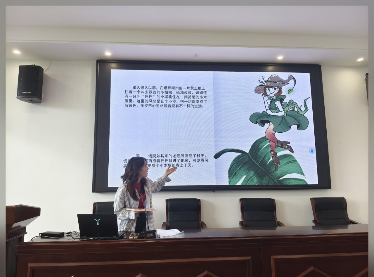 活动伊始,袁媛以亲切的提问“你们喜欢读课外书吗?”拉开序幕,迅速拉近与孩子们的距离,现场氛围瞬间活跃起来。随后,她聚焦经典儿童文学作品《绿野仙踪》,结合出版专业视角,为孩子们细腻解读书中的奇妙世界。从“房子被龙卷风卷上了天之后会发生什么”的悬念引入,到多罗西带着小狗托托、渴望智慧的稻草人、期盼心脏的铁皮人、寻找勇气的狮子一同踏上寻踪翡翠城的旅程,袁媛用生动的语言还原书中角色历经磨难、互帮互助的情节,尤其着重讲述了与奥兹大王相遇后的故事转折,让孩子们沉浸式感受角色们在追寻梦想旅途中的成长与蜕变。