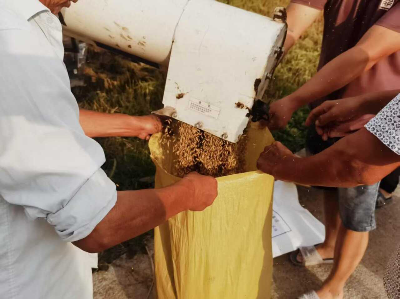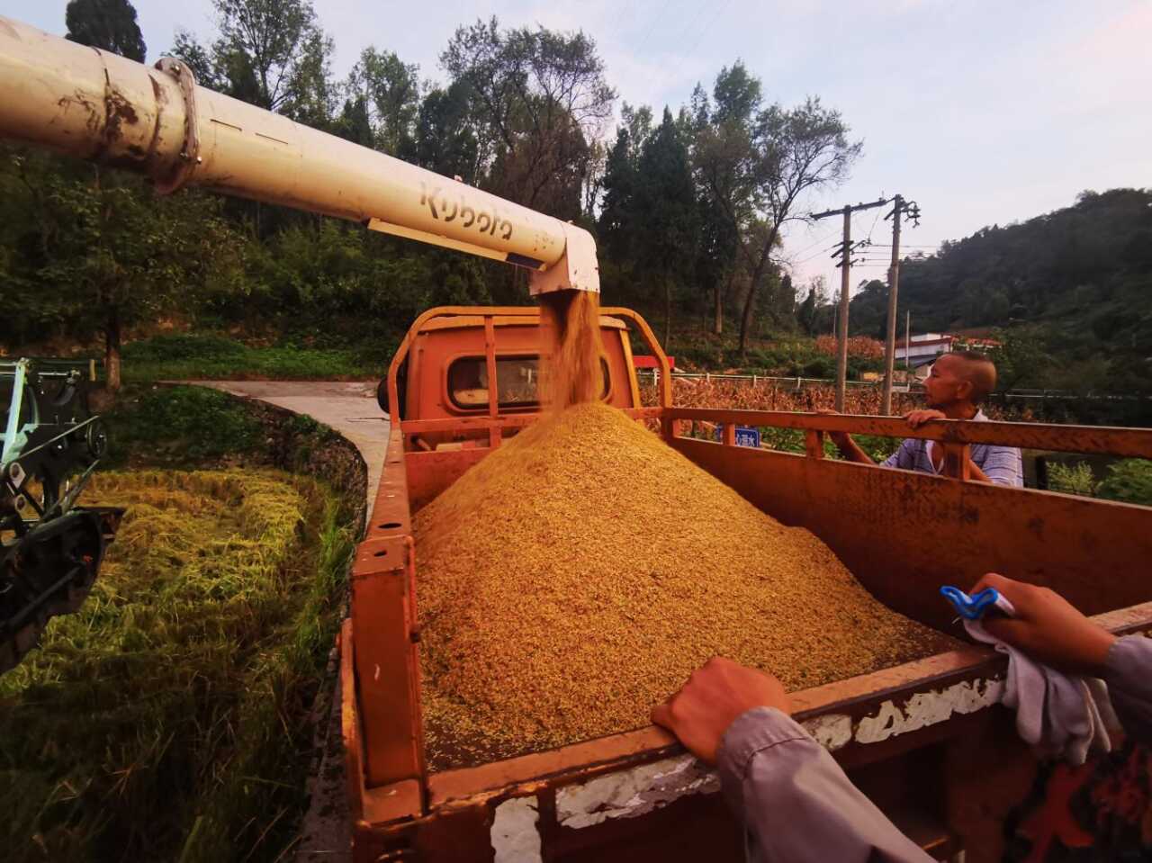 “今年我们村种了140余亩稻谷,90余亩用机器收,剩下近50亩因地势起伏用人工收,亩产差不多1000斤!”幸福村党支部书记蔡文恒笑着介绍,“这已是村里连续三四年用机器收割,每亩只要200元,一亩地20分钟就能收完,省心又划算。”