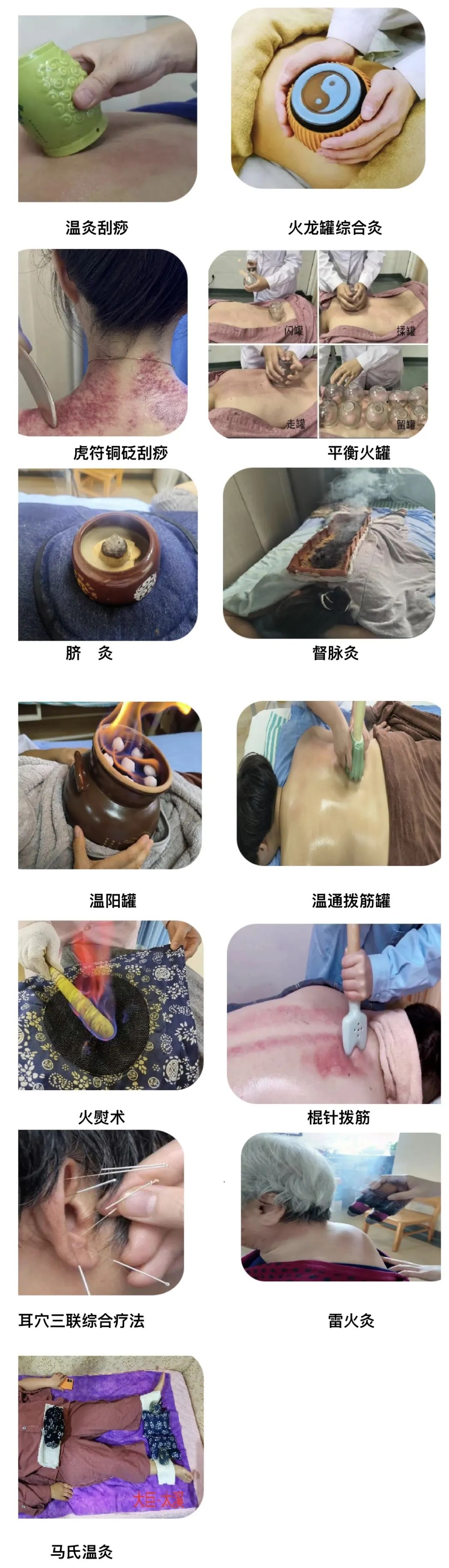 诊疗项目:开展温灸刮痧、火龙罐综合灸等特色项目30余项,每个项目各具特色,器具形式各异,操作手法经典,体验回味无穷。