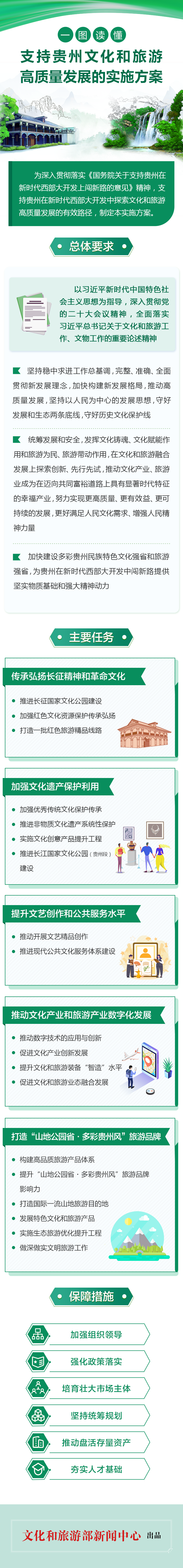 《方案》提出,文化和旅游部、国家文物局将建立工作协调机制,加大支持力度,强化政策落实,支持贵州主动作为、大胆探索,力争形成一批文化和旅游高质量发展成果。支持贵州深化国有文化和旅游企业、国有文艺院团改革,聚焦主责主业进行战略性重组和专业化整合,发展壮大一批文化和旅游企业。支持贵州科学合理规划建设文化和旅游项目,要充分考虑地方资源禀赋、发展基础、区位条件、市场需求、地方财政保障等因素,通盘考虑产业发展、土地利用、历史文化传承、人居环境整治和生态保护,严守红线,严防盲目上马和低水平、同质化建设。支持贵州强化主体责任,深化盘活存量旅游项目工作,努力提高资产质量,有效防范化解重大风险。支持贵州建设文化和旅游高等院校,完善文化和旅游人才培养、使用、评价机制,努力造就一批领军人才和中青年骨干人才。