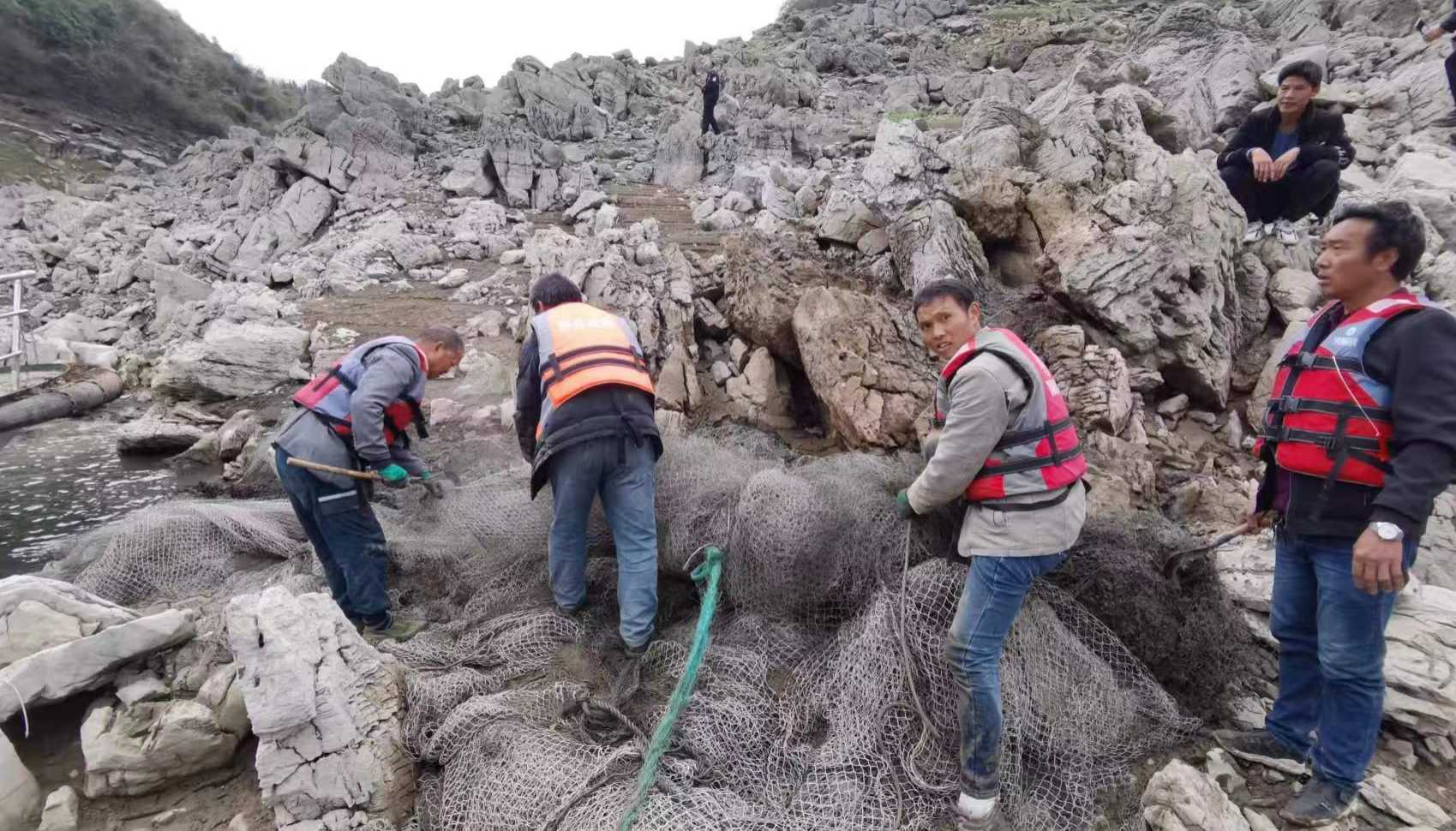 近日,息烽县乌江流域(息烽水域)水位下降,大量历史遗留的废旧网具浮在浅水区域和岸边。废旧网具本身的高分子纤维材料在水体中难以降解,严重影响水域内的生态环境和鱼类的正常繁育。为此,县禁捕专班及时组织开展清理行动,同时,在常态化监管阶段持续发力,相关执法部门同频共振,启动“水上清”+“联动查”模式,开展“十年禁渔”联合执法行动,确保政策落细落实。