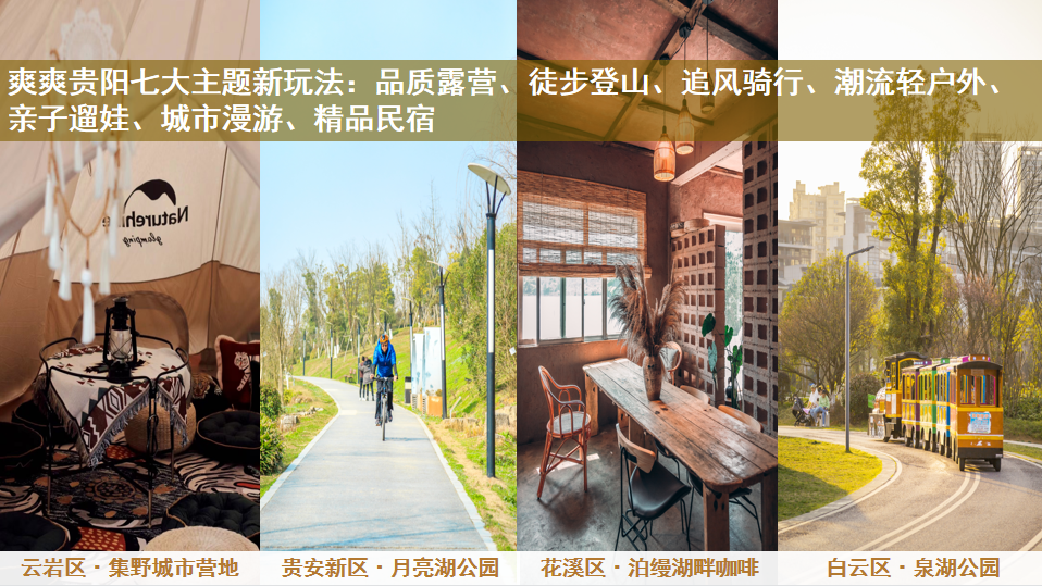 贵阳周边藏着不少度假好去处,我们整理了贵阳周边七大新潮爽游玩法和线路推荐,品质露营、徒步登山、追风骑行、潮流轻户外、亲子遛娃、城市漫游、精品民宿,七大玩法包你五天玩不够。