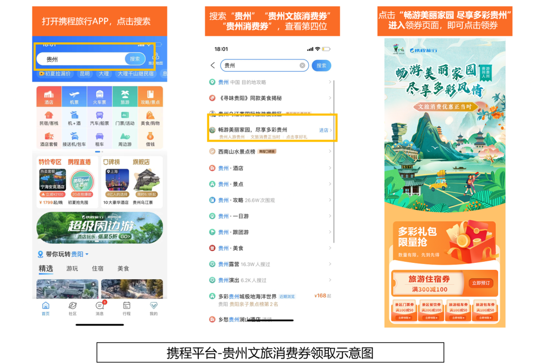 旅游住宿券:用于酒店(民宿)产品,在携程旅行APP、携程旅行小程序上发放满300减100元券,在“贵州旅游·一码游贵州”小程序上发放满200减100元券。