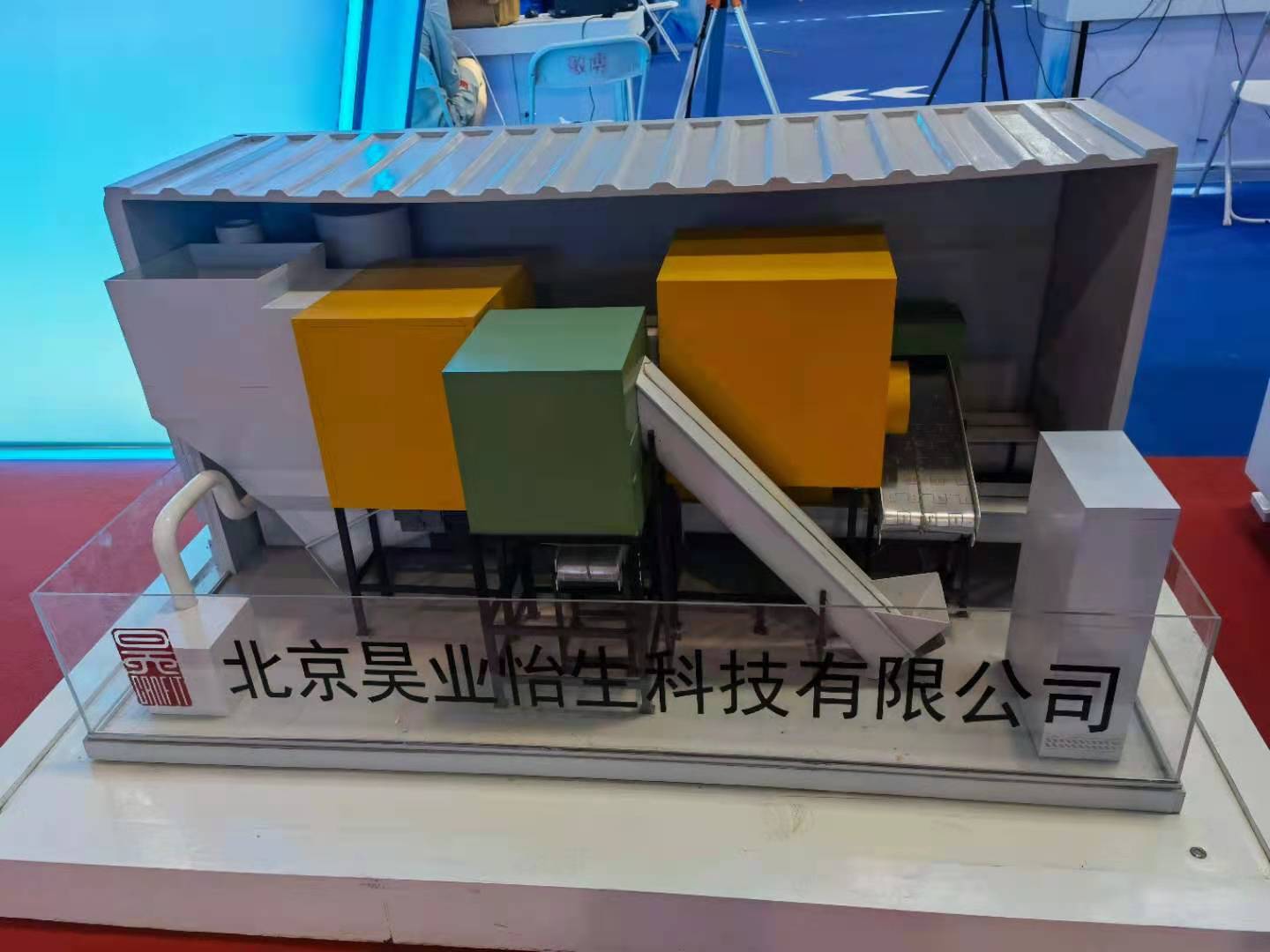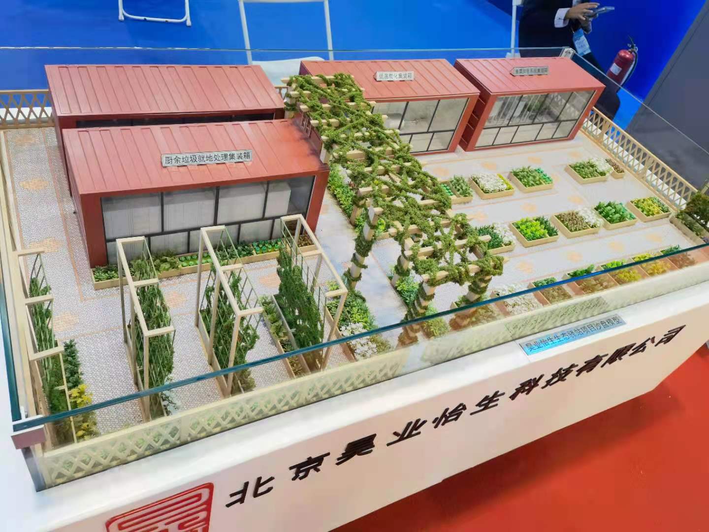 一个平面沙盘上,有三个集装箱模样的模块,分别标着“厨余垃圾就地资源化处理系统”“园林绿化垃圾低温炭化系统”“鱼菜共生系统”,三大模块化系统前栽满绿植花果。
