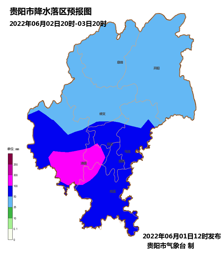 (附:贵阳6月1日夜间到2日白天、2日夜间到3日白天降水落区预报图、3日夜间到4日白天降水落区预报图和1日夜间到4日白天累计降水落区预报图)