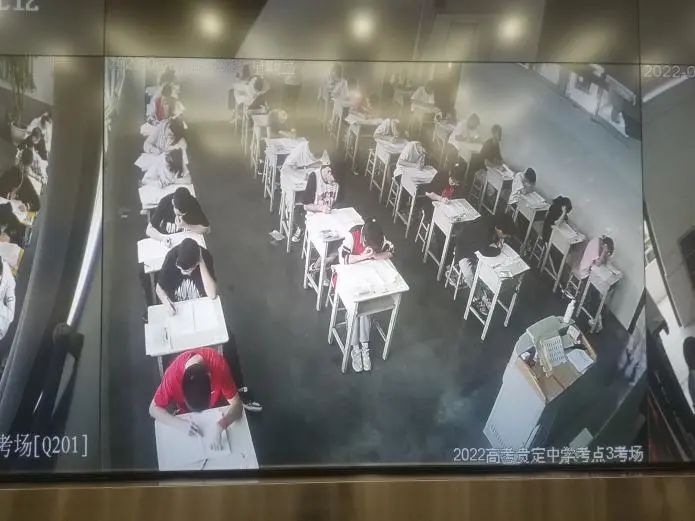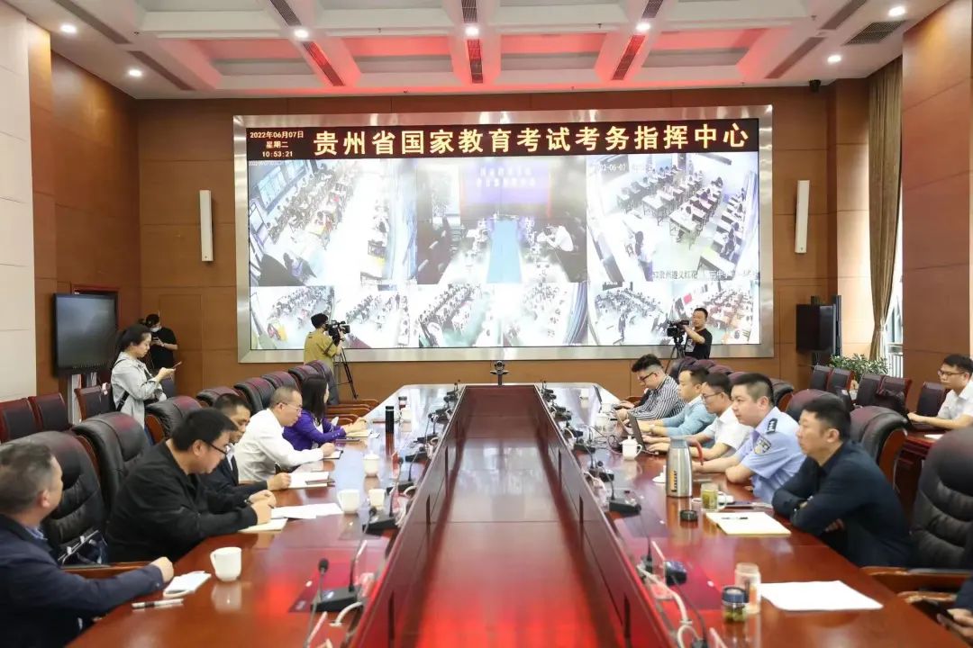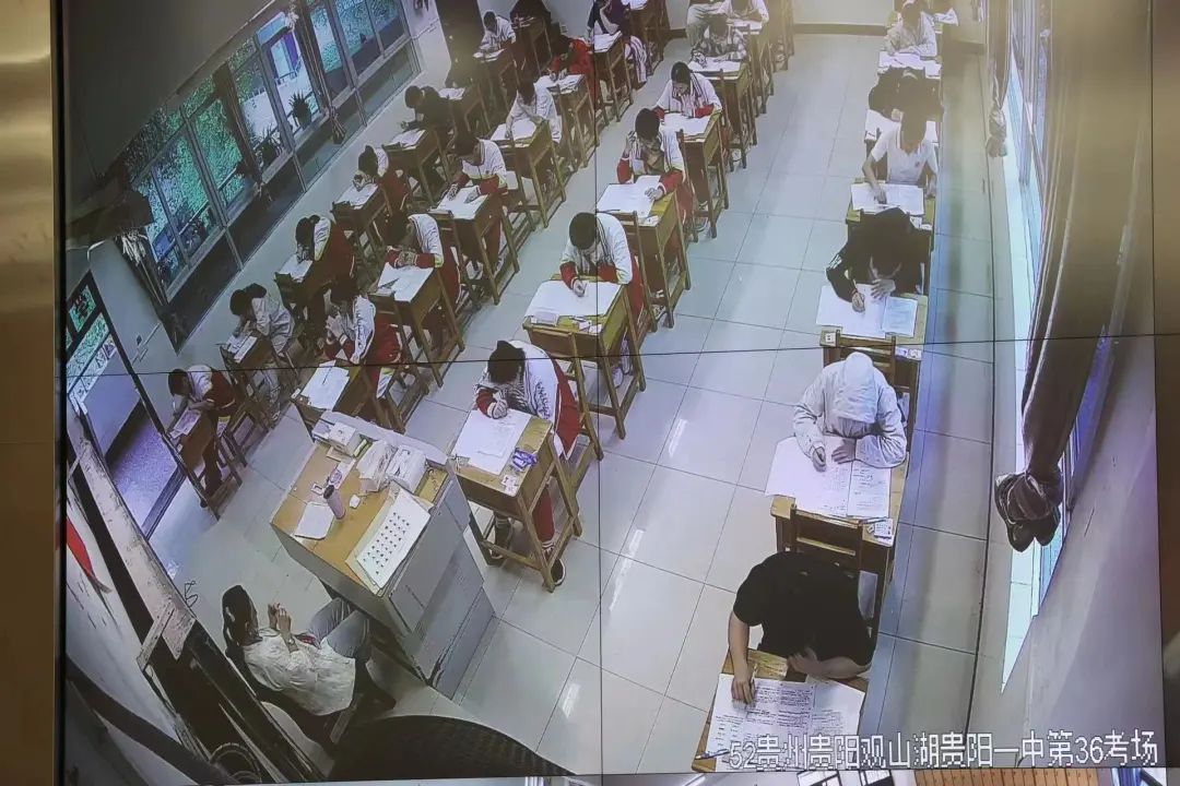 在现场,记者看到,贵州省国家教育考试考务指挥中心的监控大屏上,轮流播放着全省各个考点、考场等的监控视频,考生们正在聚精会神地答题。