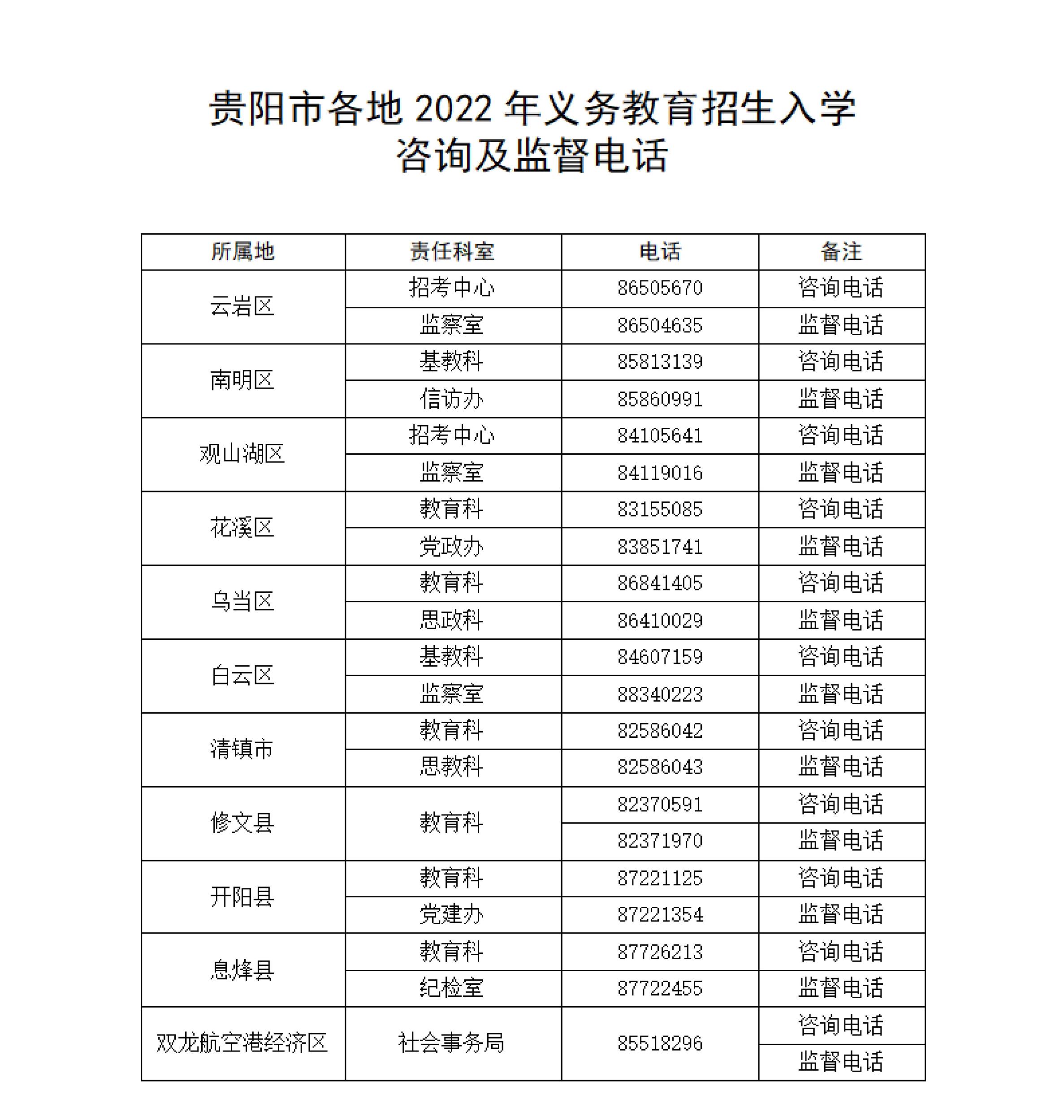 为更好的服务于学生和家长,我局针对今年义务教育招生入学工作开通了每个区县的咨询电话,具体如下: