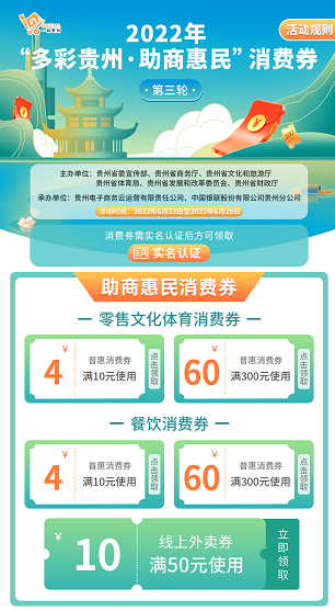多彩贵州网讯 第三轮“多彩贵州·助商惠民”消费券将分别于6月23日、24日、25日10时进行发放。券值为满10元减4元、满50元减10元、满100元减20元、满300减60元的“零售文化体育消费券”和“餐饮消费券”。消费者可通过“一码贵州”和“云闪付”APP领取。