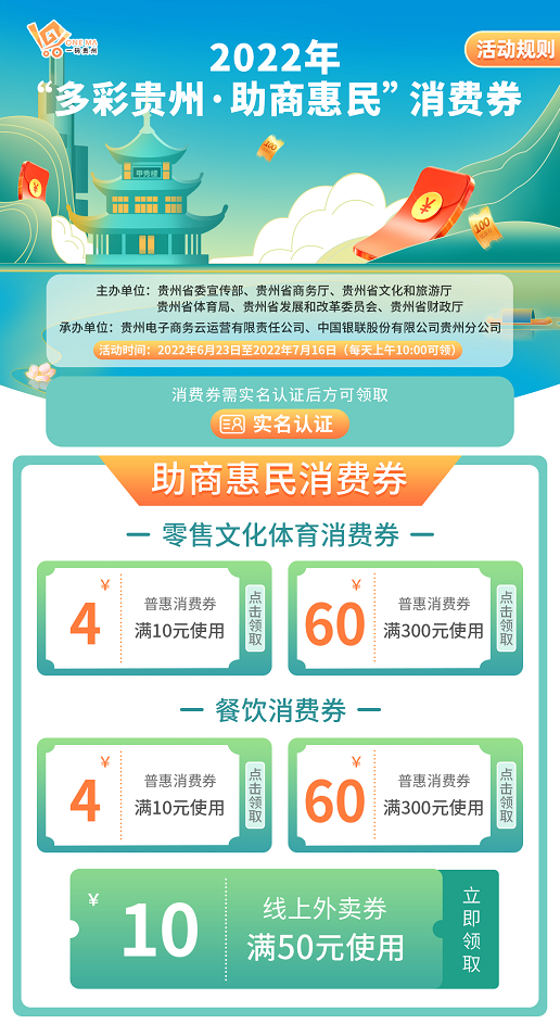 第四轮“多彩贵州·助商惠民”消费券将于6月30日、7月1日、2日每天10时发放,消费者可通过“一码贵州”APP和“云闪付”APP实名认证后领取。