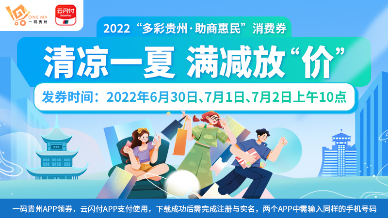 第四轮“多彩贵州·助商惠民”消费券将于6月30日、7月1日、2日每天10时发放,消费者可通过“一码贵州”APP和“云闪付”APP实名认证后领取。