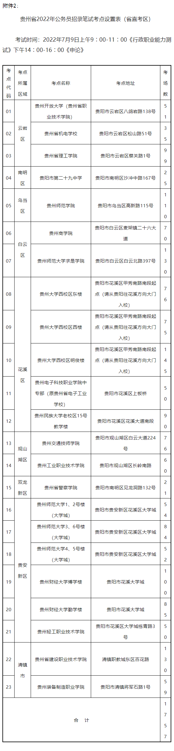 2022年全省公务员考试将于本周末(7月9日、10日)举行,其中涉及云岩区、南明区、乌当区、经开区、白云区、花溪区、观山湖区、双龙、清镇市、贵安新区共计66个考点,考场2691个。各考点考场的考试主要集中在7月9日上午、下午各一门考试,7月10日考点只涉及观山湖区会展城第一中学。(所有考点和位置信息见附件)