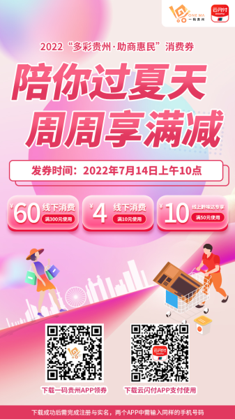 多彩贵州网讯 2022年7月14日10点,第五轮“多彩贵州·助商惠民”消费券发放,本次将连续发放三天,市民可通过一码贵州APP和云闪付APP进行领取。