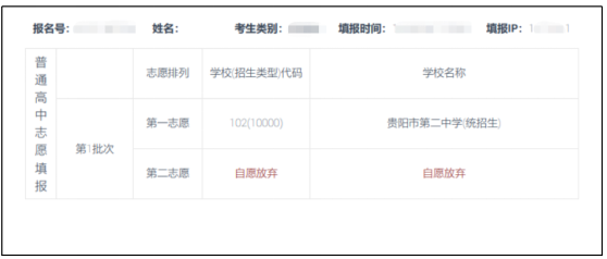 志愿提交成功后,系统显示当前已填报的补录志愿学校信息并可打印志愿填报表格。