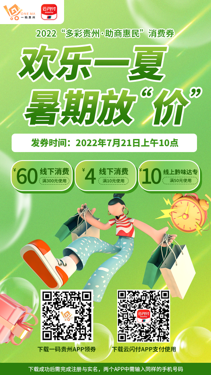7月21日起,第六轮“多彩贵州·助商惠民”消费券将连续发放三天,每天上午10点发放,数量有限,领完即止。市民可通过一码贵州APP和云闪付APP进行领取。