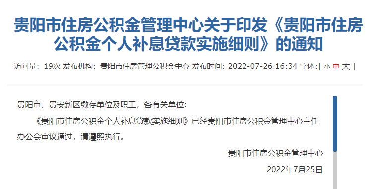 7月26日,贵阳市住房公积金管理中心发布关于印发《贵阳市住房公积金个人补息贷款实施细则》的通知,自发布之日起,符合条件的贵阳市、贵安新区缴存职工可办理个人补息贷款。