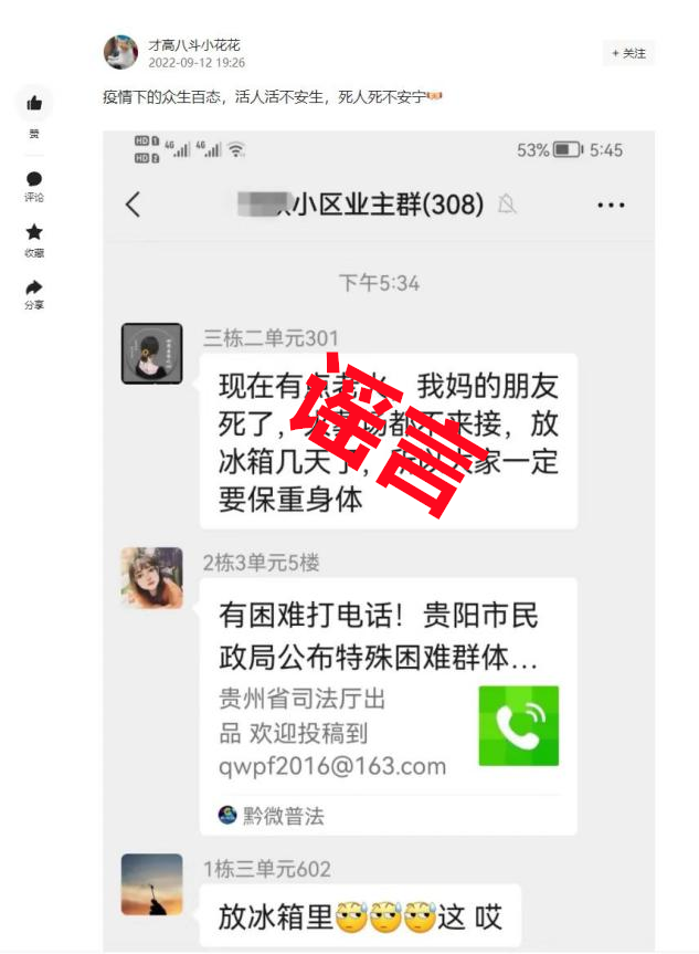 “放冰箱?应该是冰棺吧!”在惊讶之余,群内居民也提出来质疑:家用冰箱能放下一个人吗?还有居民立即转发了贵州省司法厅公众号黔微普法发布的文章《有困难打电话!贵阳市民政局公布特殊困难群体社会救助求助电话》,认为家里有人去世不会没人管,该消息不可靠。