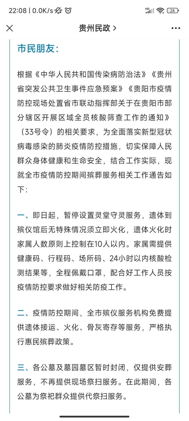 记者还发现,早在9月3日,贵阳市殡葬管理所就发布通告:疫情防控期间,全市殡仪服务机构免费提供遗体接运、火化、骨灰寄存等服务,严格执行惠民殡葬政策。