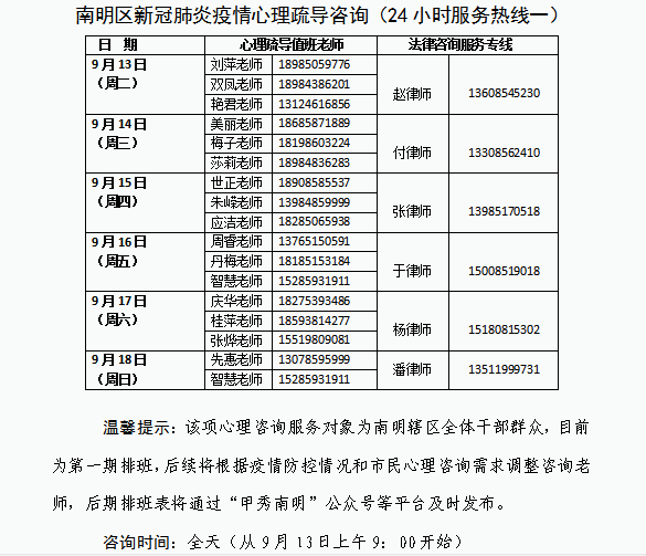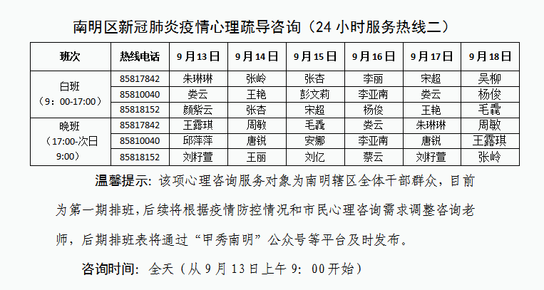 为疏导居民不良情绪,南明区新时代文明实践中心邀请贵州省家庭教育指导师联合会、贵阳市华夏心理咨询职业培训学校开通多条心理咨询热线,为辖区居民群众提供线上心理疏导、心理干预服务,有效预防与减轻疫情所致的心理困扰,多举措维护居民群众心理健康。