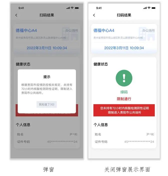 在贵阳市内扫描场所码时,未持有72小时内的核酸检测阴性证明的人员将出现"根据贵阳市疫情防控相关规定,未持有72小时内核酸检测阴性证明的人员,限制进入贵阳市公共场所。”10秒弹窗提示。关闭弹窗后,在扫码结果页面显示“您未持有72小时内核酸检测阴性证明限制进入贵阳市公共场所”。