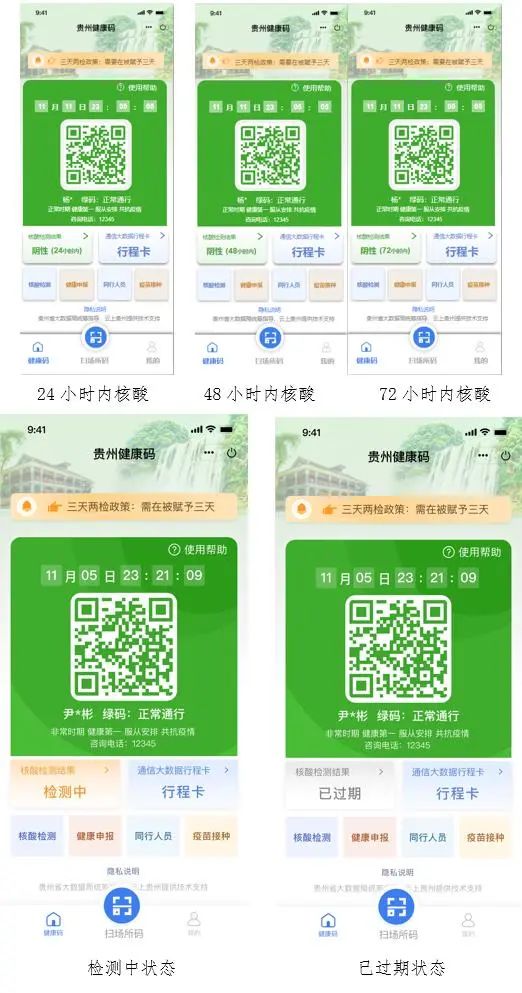 在健康码首页,根据“核酸检测结果”时间分别展示为24小时、48小时、72小时;若超过72小时,显示“已过期”;若处于检测中状态,显示“检测中”。