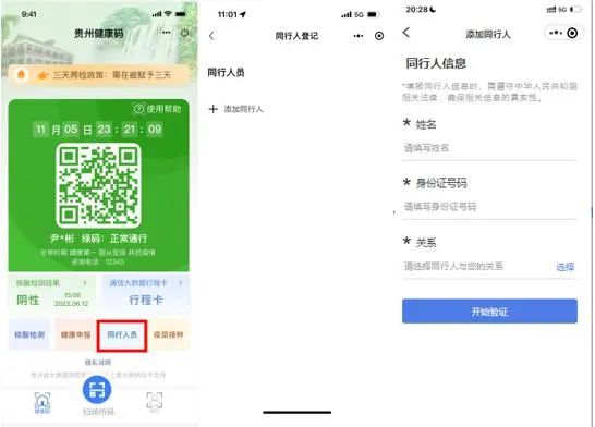①无同行人则展示添加同行人页面,点击添加同行人则跳转至同行人登记页面,登记成功后即可显示列表,点击对应卡片展码。