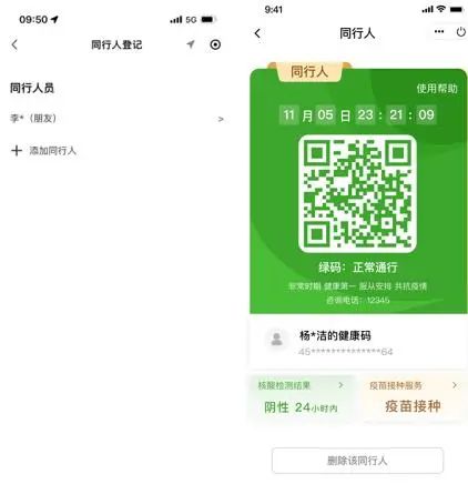 首页界面将之前的“疫苗服务”改为“同行人员”,通过下面同行人员模块进入同行人登记页面,点击具体同行人查看同行人展码详情界面。