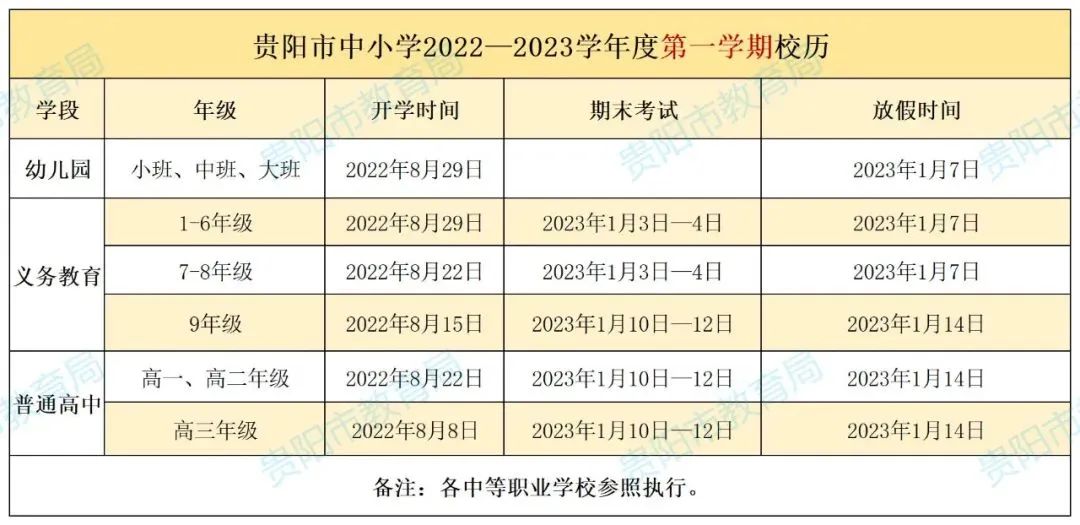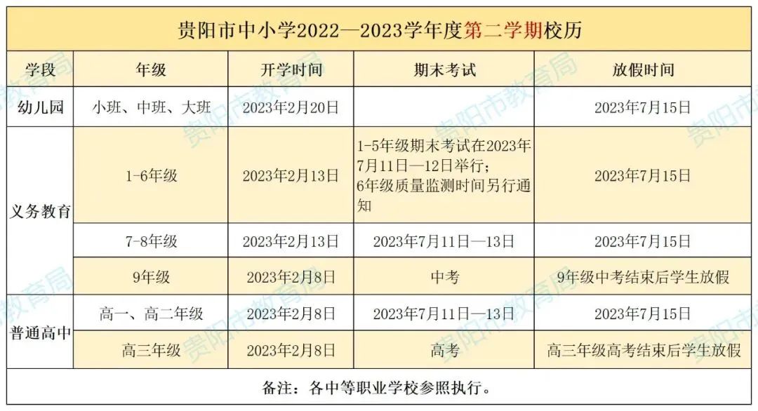 根据《省教育厅办公室关于2022-2023学年全省中小学(幼儿园)校历时间安排的通知》和《贵阳市中小学2022-2023学年度校历》,贵阳市中小学(幼儿园)本学期的期末考试、学校放假时间安排如下,一起来看↓↓↓