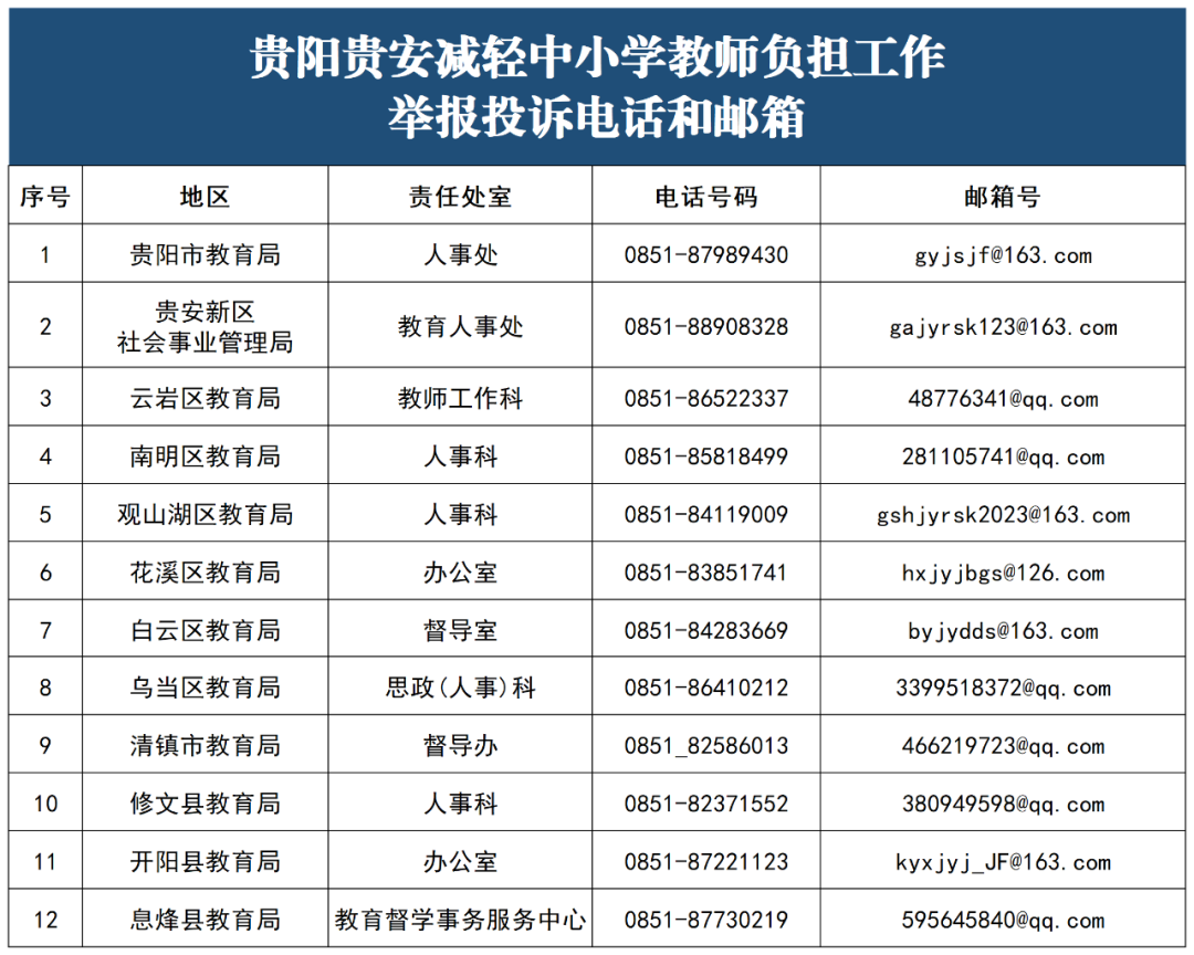 为切实减轻中小学教师负担,进一步营造良好的教育教学环境,3月12日,市教育局面向社会公开2025年贵阳贵安减轻中小学教师负担工作举报投诉电话和邮箱,接受广大群众监督,一起来看——