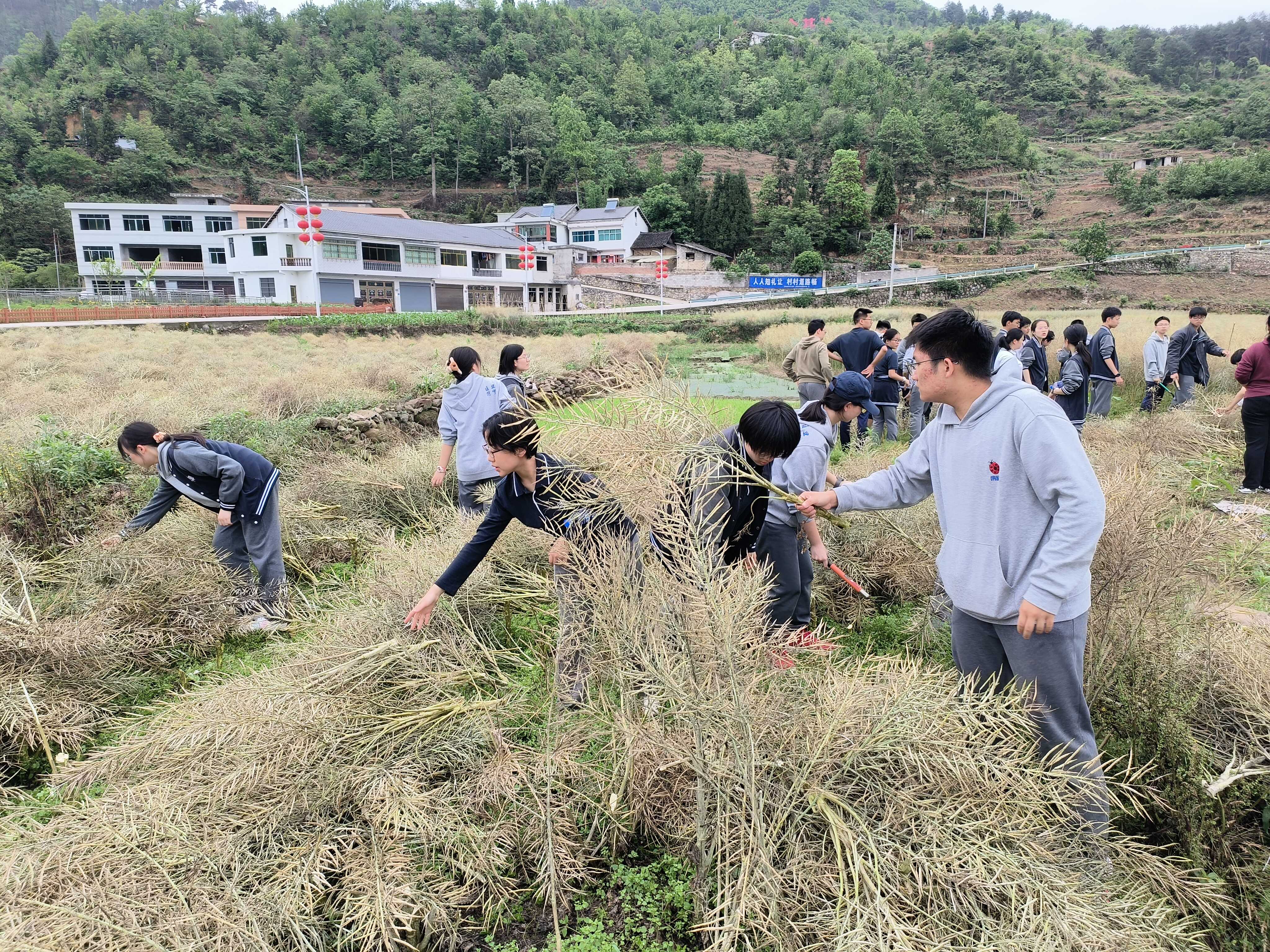 恰逢油菜成熟,田间地头里学生三两结伴,正在体验收割菜籽。“今天很高兴感受了鹿窝村的青山绿水和风土民情,而且还体验了做农活,‘粒粒皆辛苦’的体会好深刻,以后我一定更加珍惜食物。”李薇同学表示。