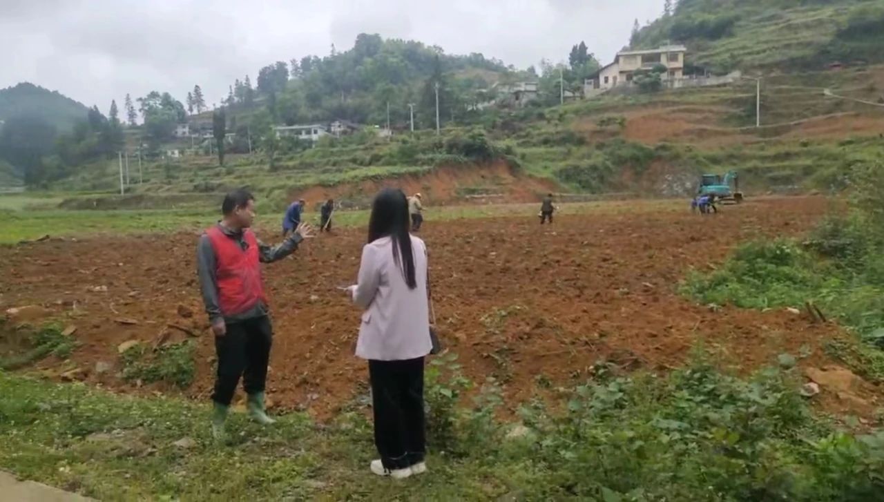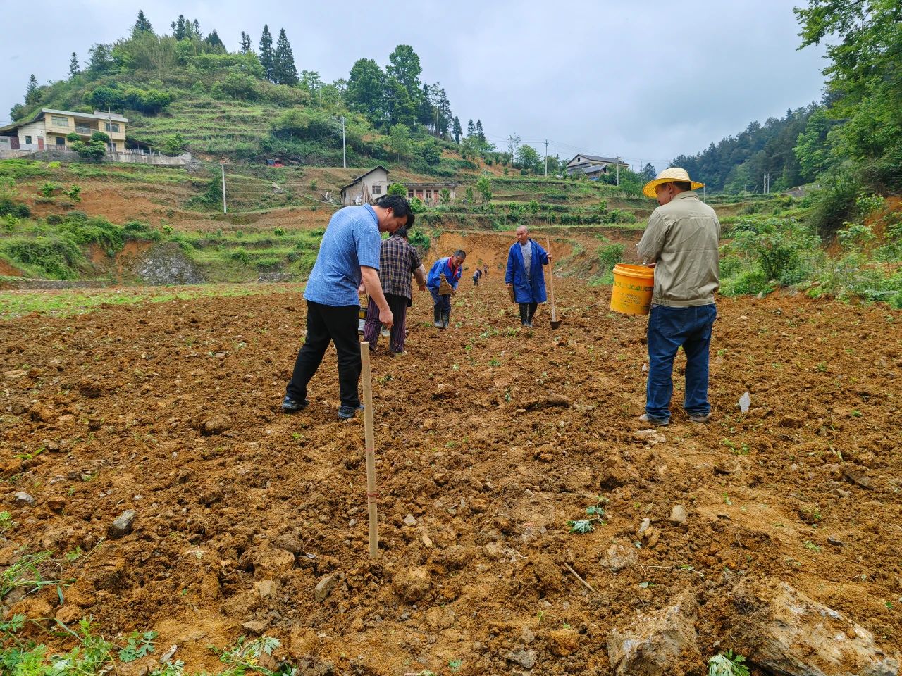 村民们正拿着工具在田地里来回穿梭,一边“打窝”,一边播种,农技人员现场指导种植技术,现场一片繁忙劳作景象,昔日的撂荒地已换了新貌。