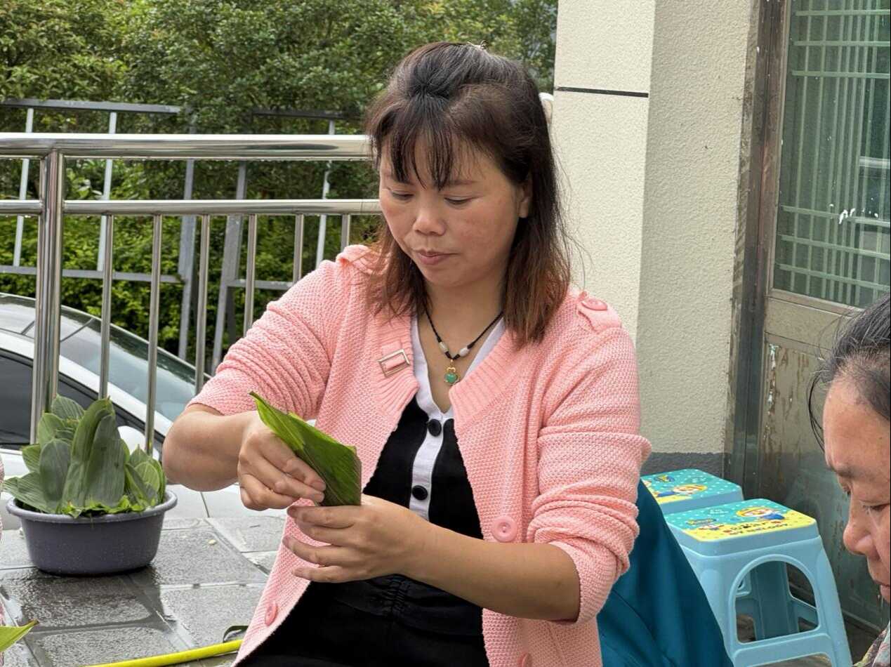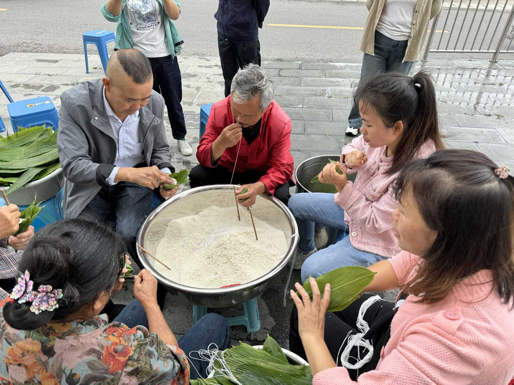 活动现场,村民们捋粽叶、做漏斗、填糯米、压紧实、封口捆绑,一系列动作行云流水,一气呵成,在一双双巧手翻飞舞动下,一片片粽叶、一粒粒糯米都变成了一个个饱满而诱人的粽子,经过大家几个小时的辛勤劳动,粽子装满了一大盆,大家一起聊着端午习俗,唱着民间小调,现场其乐融融,欢声笑语不断。
