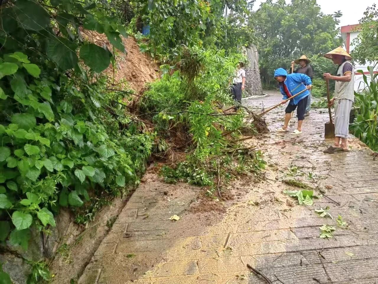 “村‘两委’组织保洁员和党员群众对道路泥沙进行清理打扫……”