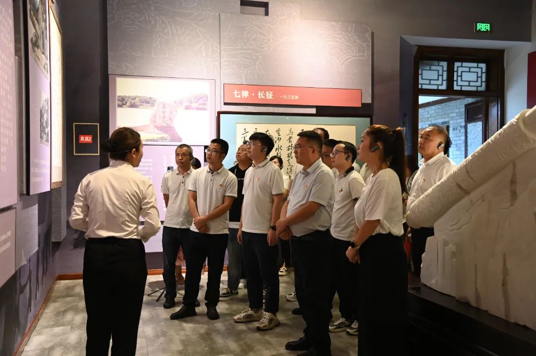 小雨淅淅沥沥,松柏巍然挺立。全体党员来到毛泽东诗词馆,“问苍茫大地谁主沉浮”“战地黄花分外香”“雄关漫道真如铁”“江山如此多娇”“敢教日月换新天”五大展区以时间为主线,结合史实展现毛泽东同志一生中主要的诗词作品。“……雄关漫道真如铁,而今迈步从头越;从头越,苍山如海,残阳如血。”大家不由自主地吟诵着这首气壮山河、雄浑壮阔的《忆秦娥·娄山关》,仿佛当年红军铁血长征中征战娄山关的激烈场景就在眼前,也让大家感受到红军百折不挠的革命精神。