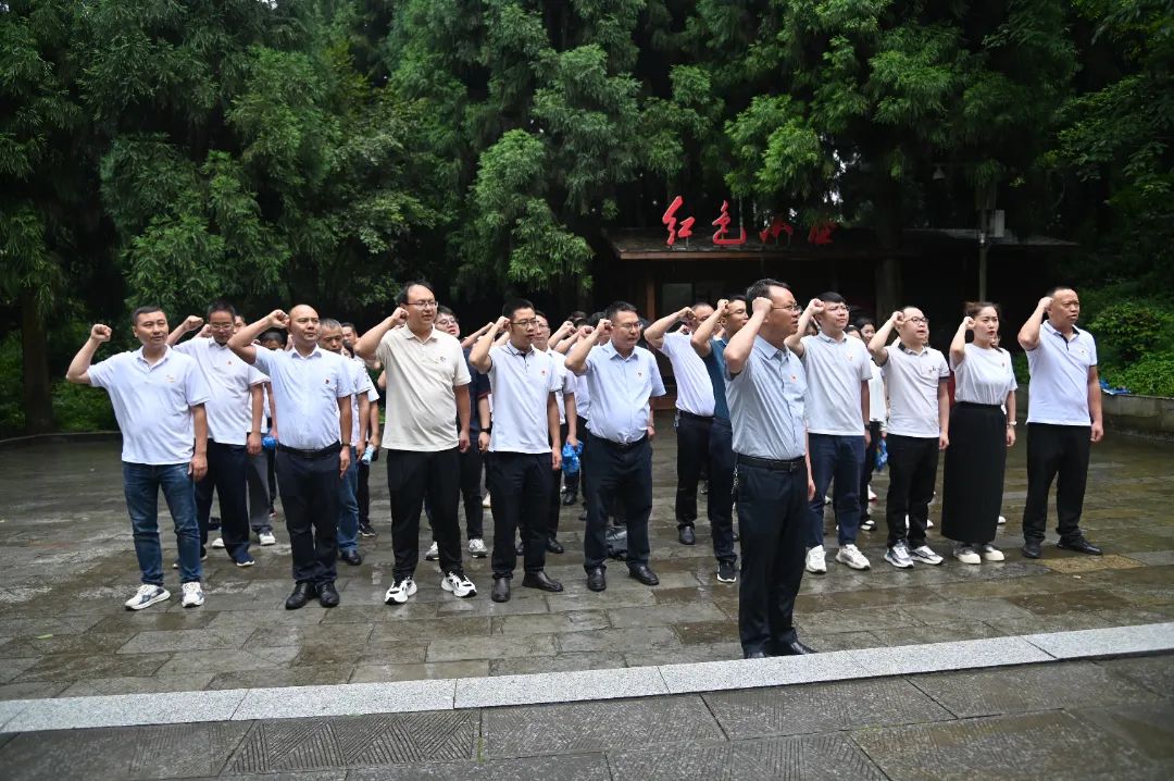 在讲解员的带领下,听着娄山关战役的光荣历史,穿过红军林,跨过长空桥,来到烈士纪念碑前。大家整齐列队,向革命先烈默哀致敬,敬献花篮,表达对先烈的崇高敬意和深切缅怀。面向党旗,全体党员举起右拳,重温入党誓词,回忆入党初心,再次许下对党和人民的忠诚誓言。
