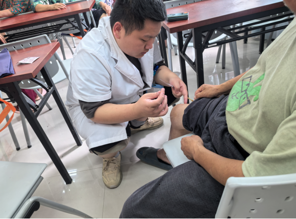 在知识讲座结束后,活动进入了义诊环节。卫生院的中医科医生们为12位患病村民提供了免费的中医针灸理疗服务。针灸作为中医的重要治疗手段,具有调节身体机能、缓解疼痛、促进血液循环等多种功效。此次义诊不仅让村民们体验到了中医的魅力,也切实解决了一些健康问题。