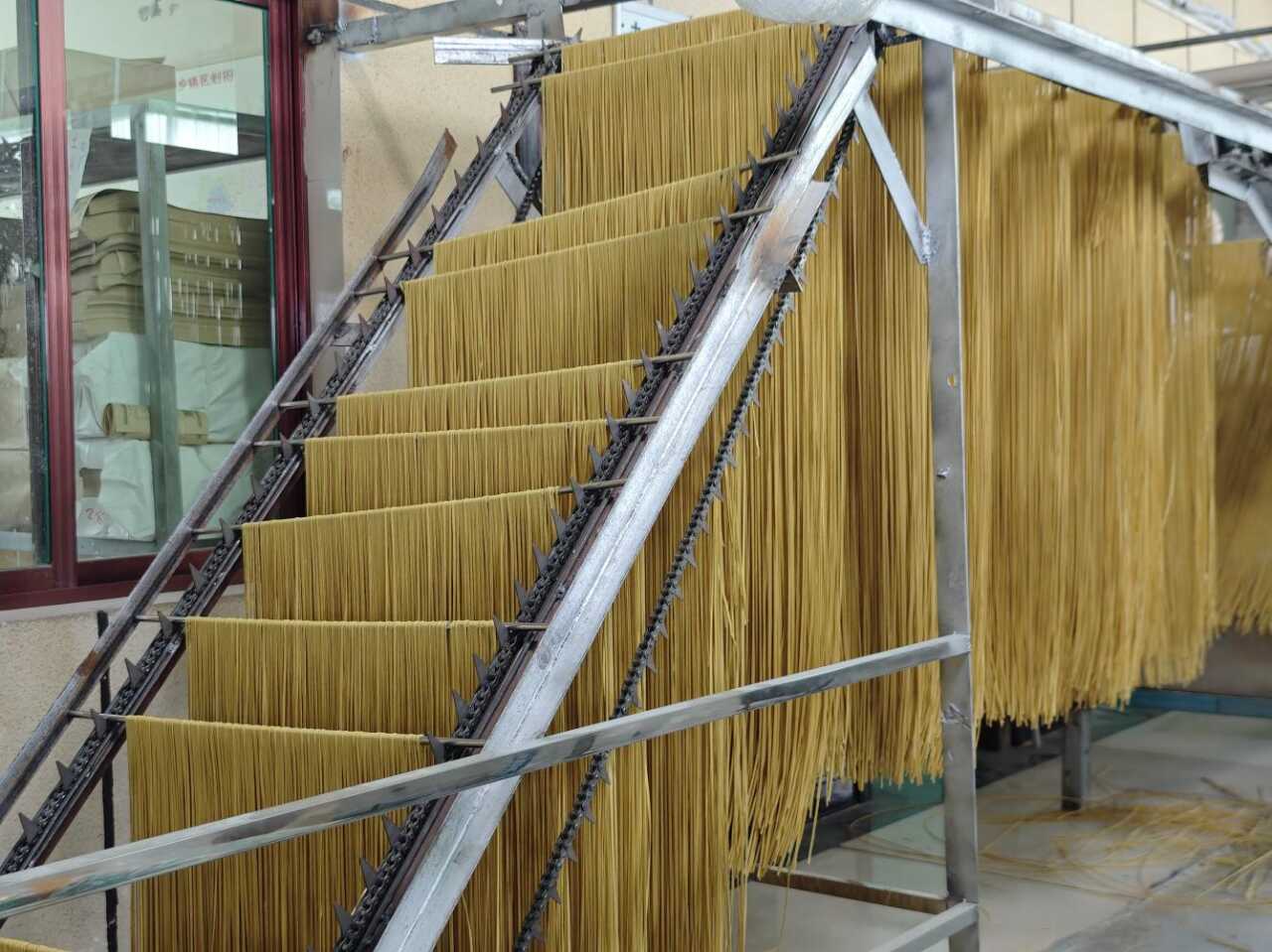 从真空和面开始,历经熟化、压片、切条、烘干等精细工序,原本松散的面粉逐渐蜕变,一根根筋道的面条初见雏形。紧接着,它们被整齐地移送至晾干区,享受着适宜的温度与通风,待完全晾干后密封,一箱箱包装精美的挂面便“整装待发”,承载着当地人的希望驶向远方。