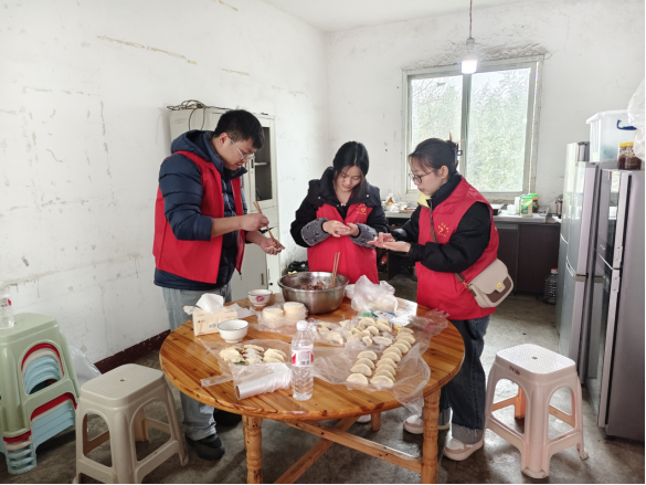 活动当天,志愿者一早便开始忙碌,买材料、调馅、包饺子、分装打包,分工明确,不一会儿,一个个圆滚滚的饺子就摆满了桌面,打包完成后,志愿者入户上门将打包好的饺子一一送到群众家中,并关心关爱老人及未成年人的生活情况、学习情况,陪伴老人谈心、聊天。