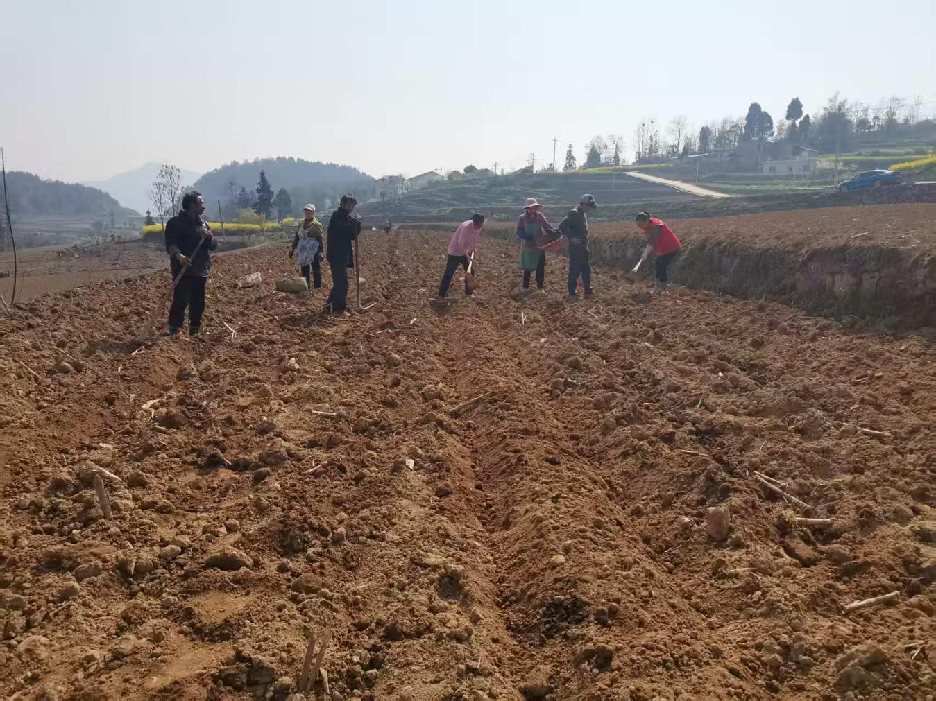 一大早,在和平村村民徐开甲家的玉米地里,前来帮忙的寨邻和驻村工作队员拿着锄头,穿梭在田间地头,翻土、打窝、撒种、施肥、覆土……大家分工忙碌、干劲十足。