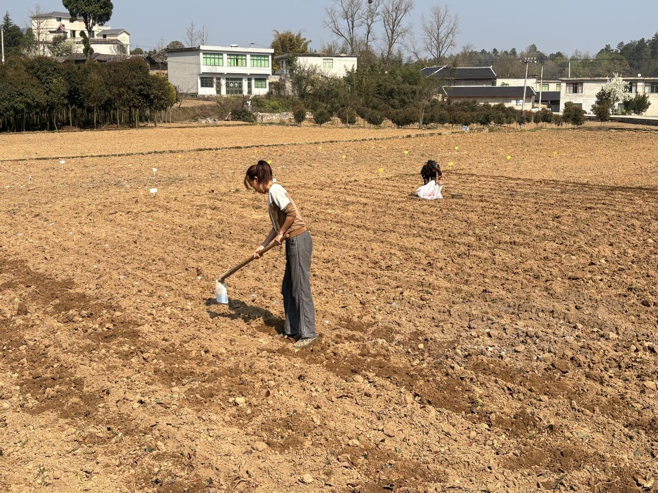 在前进村和亲戚寨村的田间,农户分工协作,有序进行翻土、打窝、撒种、覆土等作业。