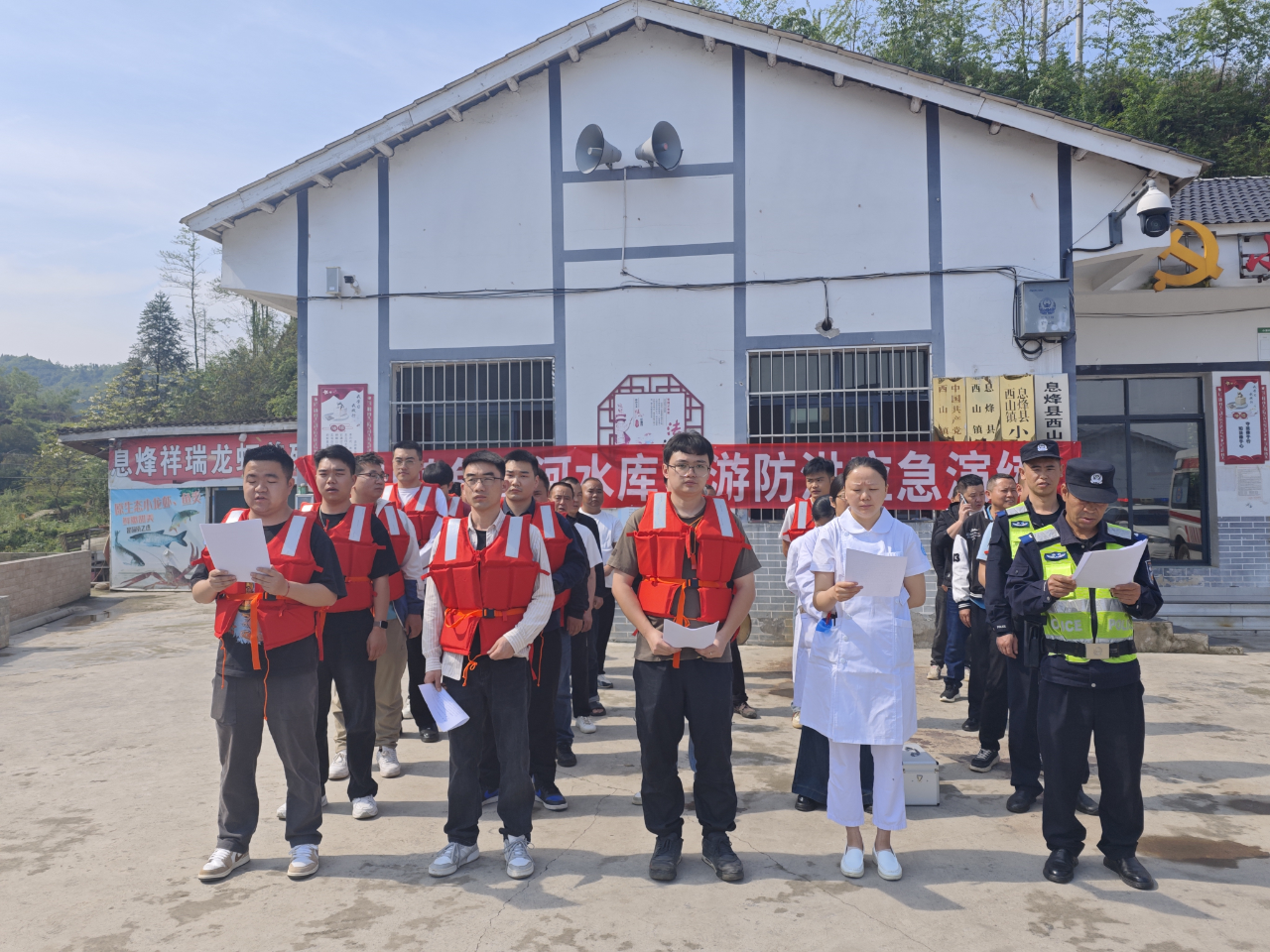 此次演练模拟西山镇连续遭遇强降雨,鱼简河水库水位暴涨,超过汛期限制水位,小堡村位于鱼简河水库下游,极有可能遭受洪水灾害威胁为背景。西山镇接到鱼简河水库管理处预警信息后,镇党委、镇政府迅速启动防汛应急预案,秩序维护组、转移安置组、医疗救护组、后勤保障组闻令而动。