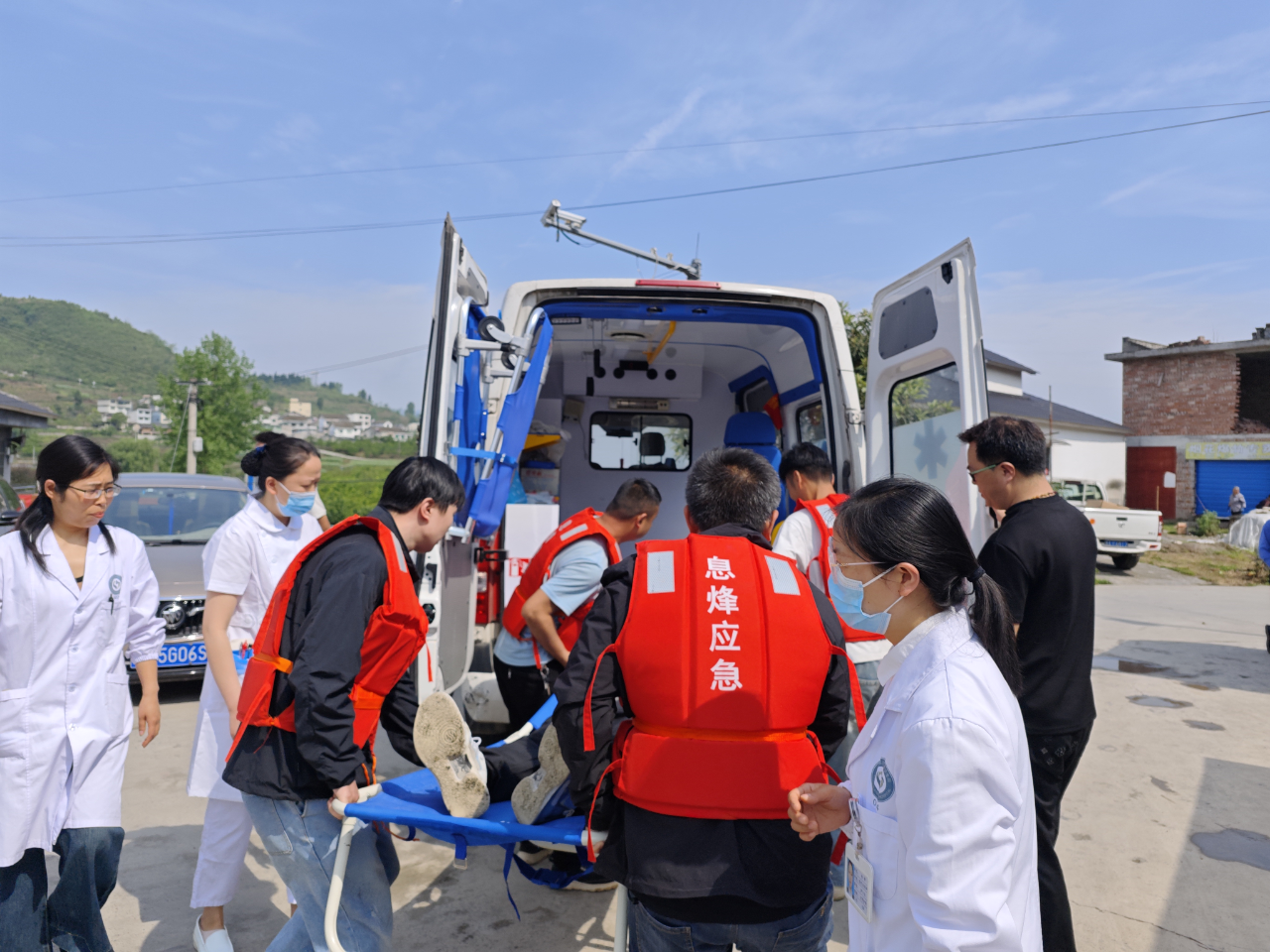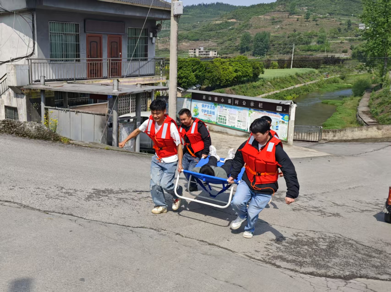 秩序维护组第一时间设置警示标志,进行临时交通管制,疏导人员、车辆;转移安置组联合小堡村村干部,采用“铜锣+广播+入户喊话”模式,提醒群众转移至安置点。“小堡村村委会前,发现1人不慎落水,正在组织救援。”“请医疗救援组立即前往做好救治准备。”根据转移安置组传来的现场情况,指挥部立即作出调令,医疗救援组随即展开救治。整个演练过程各环节衔接紧密、配合默契,充分展示了应急救援队伍的实战能力。