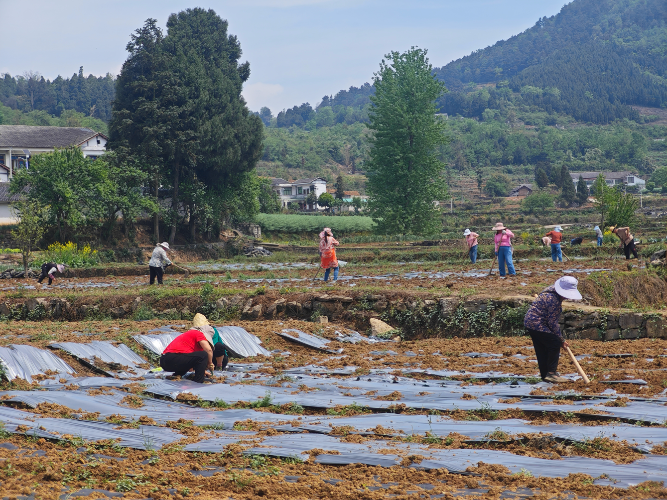 基地里,村民们分工协作,配合默契。平地、起垄、覆膜、接种、覆土……一道道工序有条不紊地进行着。在春日暖阳映照下,一排排整齐的田垄焕发出勃勃生机,孕育着丰收的希望。