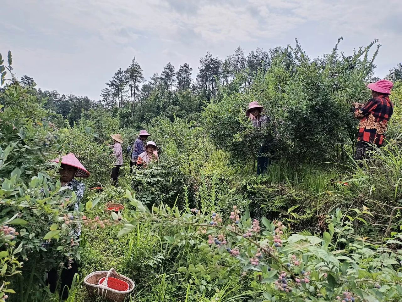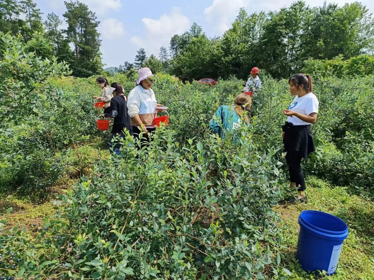 走进蓝莓基地,许多游客拎着小篮子,一边采摘一边拍照打卡,享受着田园采摘的快乐。“我们是周边乡镇的,听说这里的蓝莓熟了,就过来体验采摘乐趣,这儿的蓝莓果子又大又甜,我要多摘一两斤回去泡酒,价格也很实惠,每斤15元,终于实现‘蓝莓自由’了。”游客张亮说道。