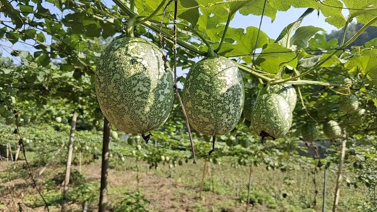 吊瓜又名栝楼,因其形状似小西瓜,果实从藤上向下挂,故名“吊瓜”。它个头虽小,但是一种名贵中药材,皮、籽、根均可入药,具有润肺化痰、降火止咳、消肿祛毒等功效。同时,它的籽质脆肉满,香气浓厚,是休闲食品瓜子中的极品。