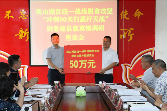 座谈会上,鹿窝镇相关负责人汇报了鹿窝镇脱贫攻坚情况,调研组对鹿窝镇脱贫攻坚表示肯定,并向鹿窝镇捐赠了帮扶资金50万元,帮助鹿窝镇抓好脱贫攻坚工作,奋力冲刺90天,打赢总攻歼灭战。
