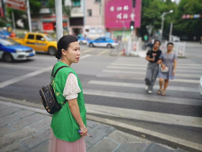 上午9点,记者在文化西路下面的红绿灯路口看到,该路口四个方向的斑马线两端均站着志愿者,他们身穿绿马甲,拿着“文明礼让”的小旗子,提醒行人遵守交通规则,莫闯红灯。