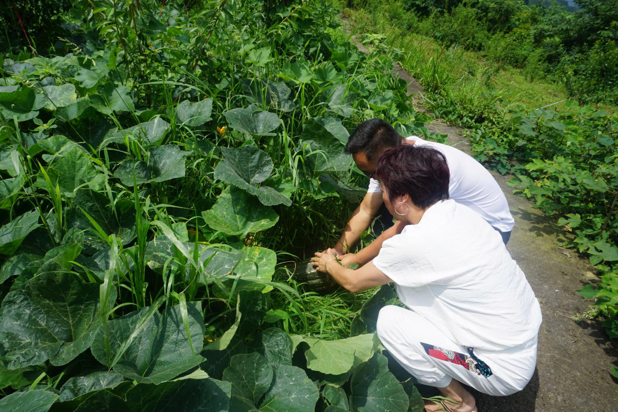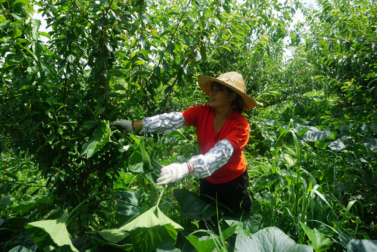 村民郑仕英正在清理脆红李树上的南瓜藤蔓。去年她家在脆红李树下套种了牛腿南瓜,收益很不错,今年又继续套种,她跟记者算了一笔账:“我家拿了10亩地入股脆红李种植,每年可获得土地分红2000元,套种的牛腿南瓜大概收益3000余元,今年还多了一笔反承包费1700元,收入比往年种植传统农作物强太多了。”