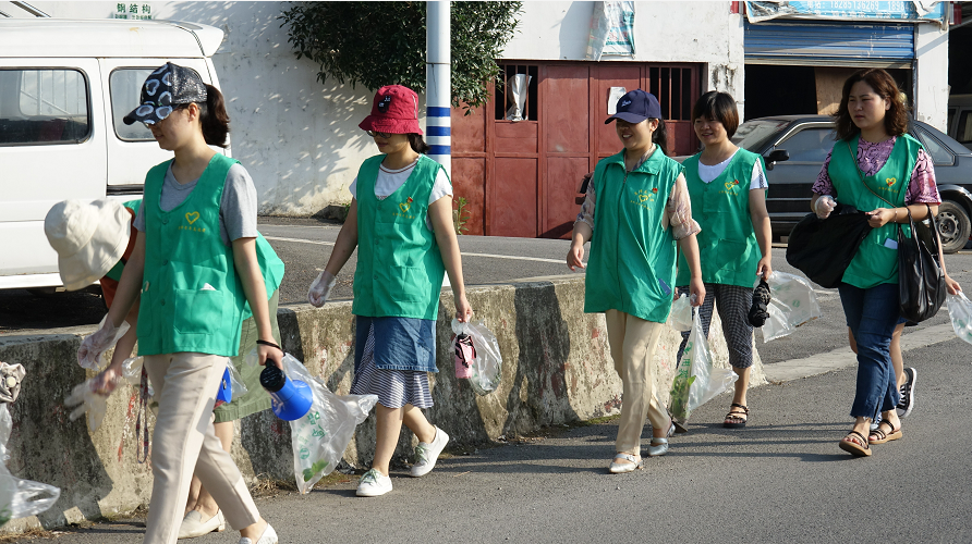 巾帼队伍精神抖擞,边走边拾路边垃圾