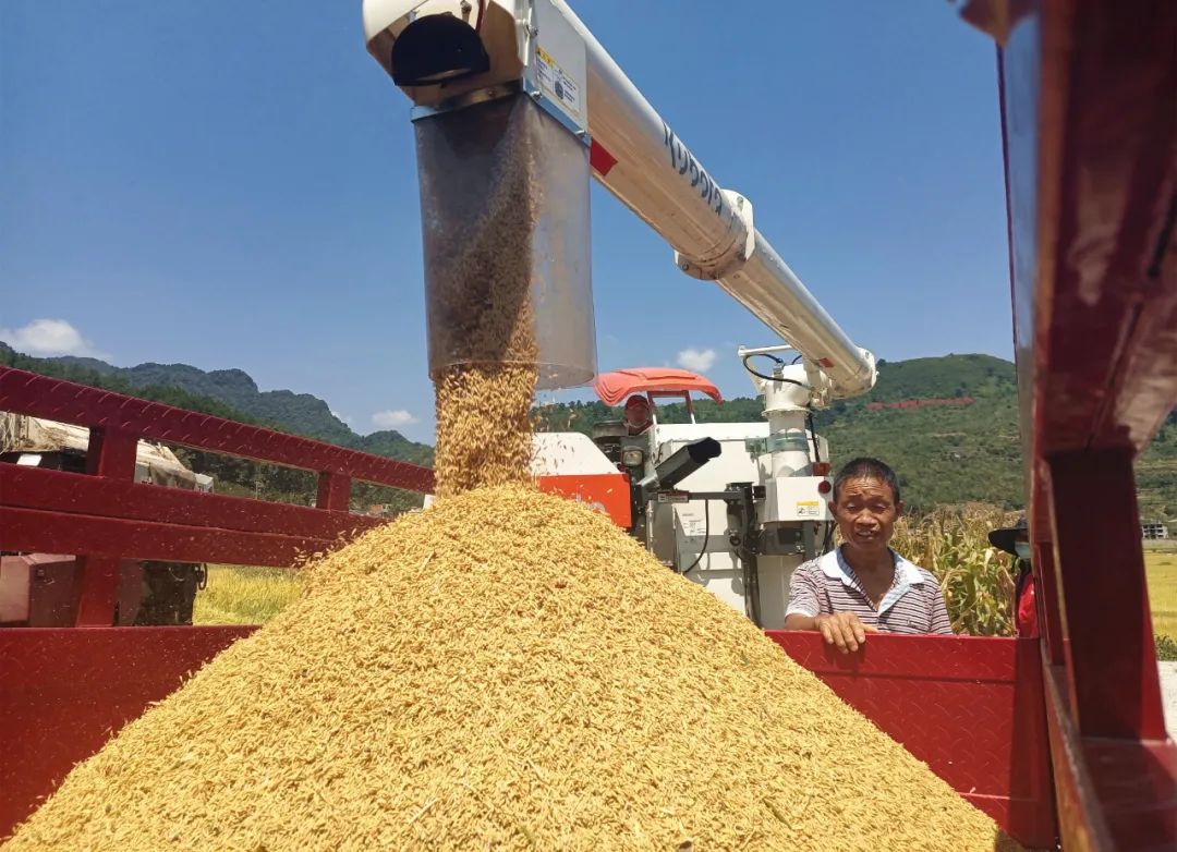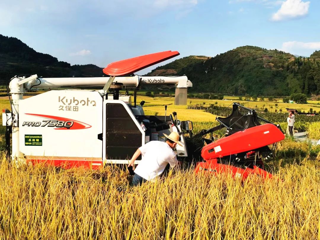 在西山镇鹿窝村水稻高产示范点,收割机正在忙碌
